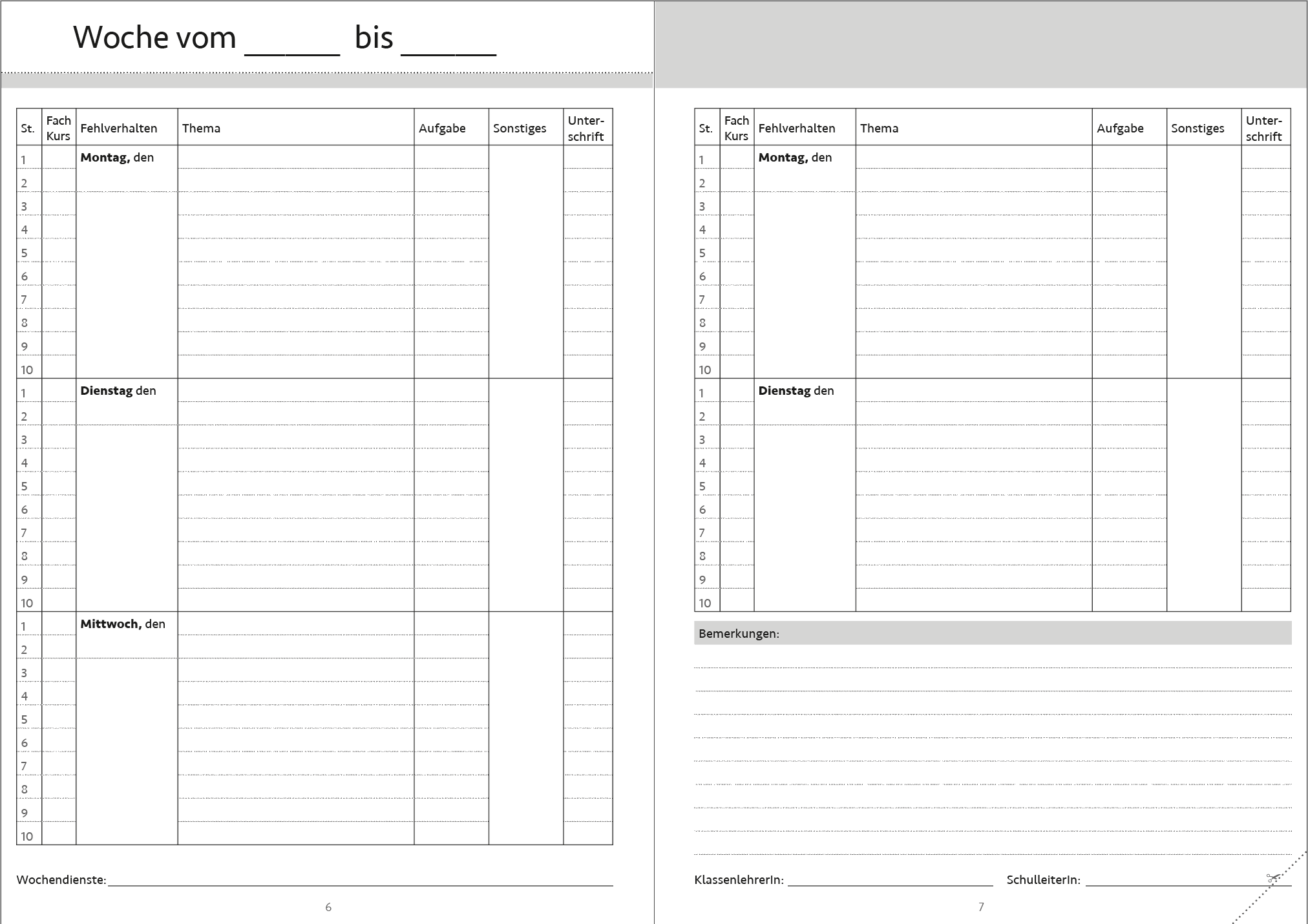 Im Mittelpunkt stehen die Wochenseiten mit der Hausaufgabenorganisation, welche selbstbestimmtes Lernen unterstützten.